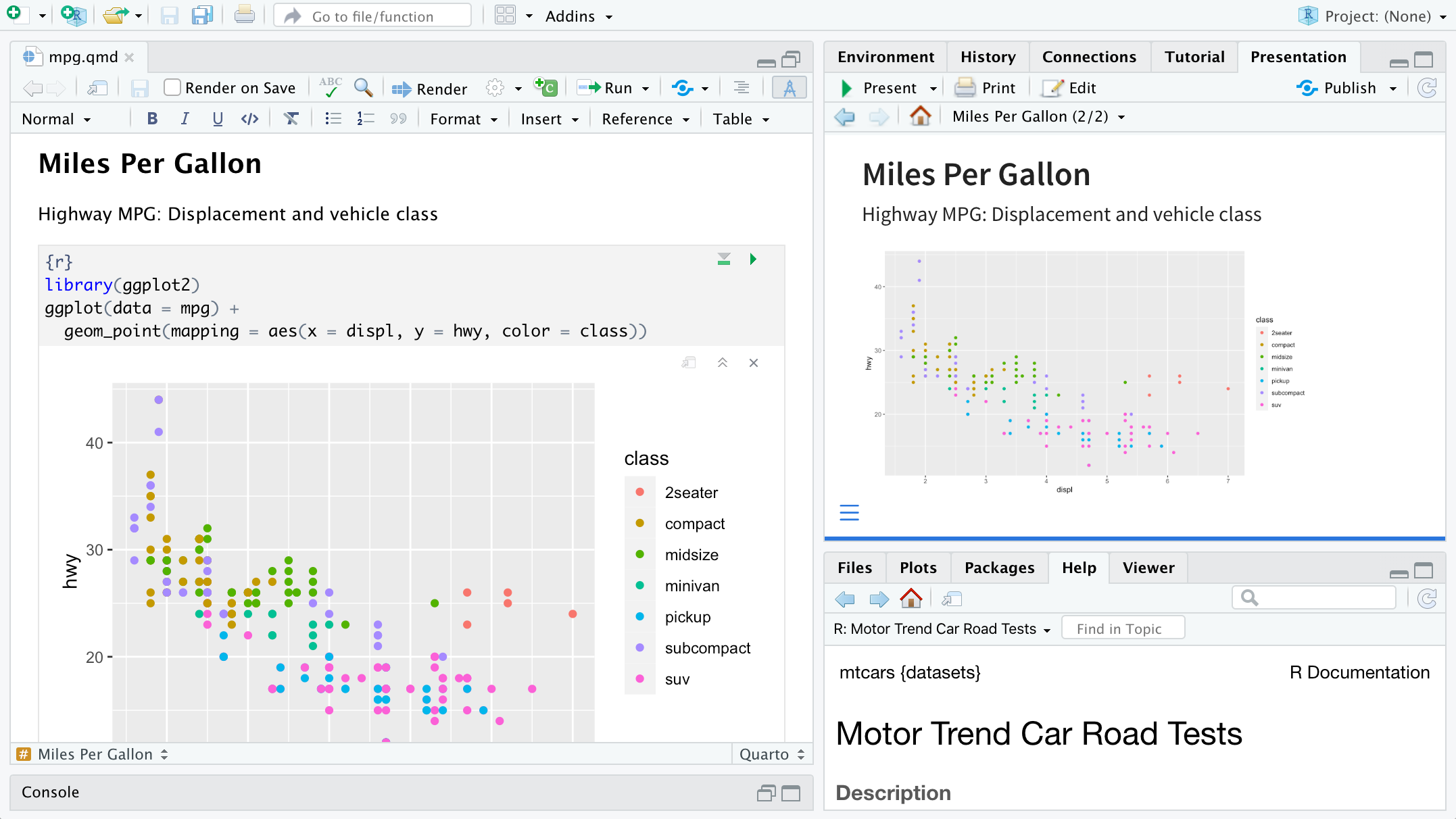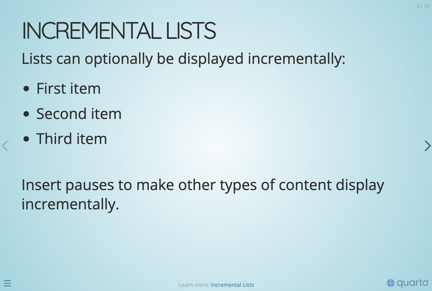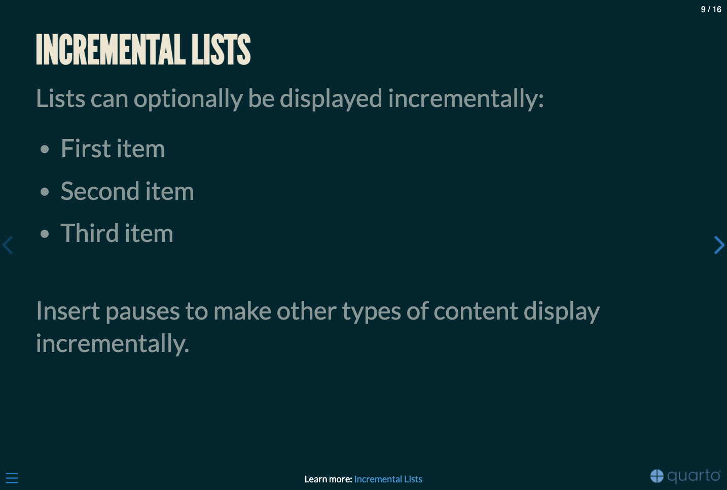 While this is a good starting point for learning about Quarto presentations, this presentation will show you examples of what you can do with Quarto and Reveal.js, including: